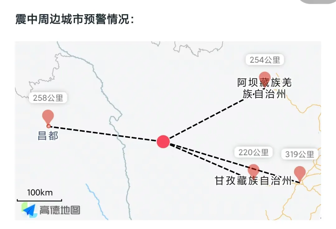 大陆多灾种预警网为距震中220千米的甘孜藏族自治州,预警时间52秒,轻微震感;距震中254千米的阿坝藏族羌族自治州,预警时间60秒,可能有震感;距震中256千米的昌都市,预警时间60秒,可能有震感;距震中316千米的雅安市,预警时间74秒,可能有震感。