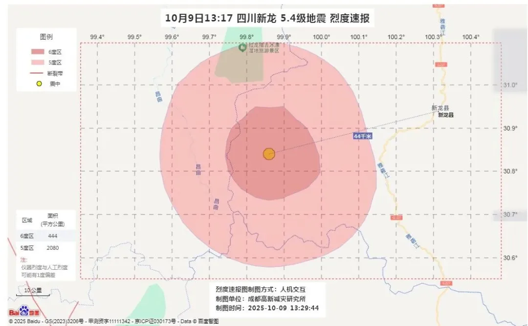10月09日13时17分 四川甘孜州新龙县(北纬30.84度,东经99.86度) 5.4级地震,震源深度10千米,四川、云南多地有明显震感。
