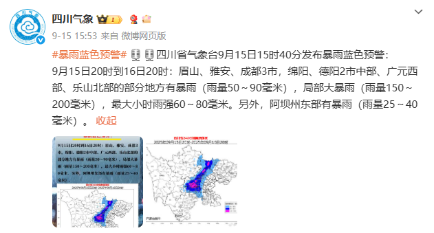 四川省气象台9151540分发布暴雨蓝色预警: 91520时到1620时:眉山、雅安、成都3市,绵阳、德阳2市中部、广元西部、乐山北部的部分地方有暴雨,局部大暴雨。另外,阿坝州东部有暴雨。暴雨期间导致多地发生内涝、泥石流等自然灾害,9151642分,四川乐山犍为县发生4.0级地震,给民众造成了较大的影响。
