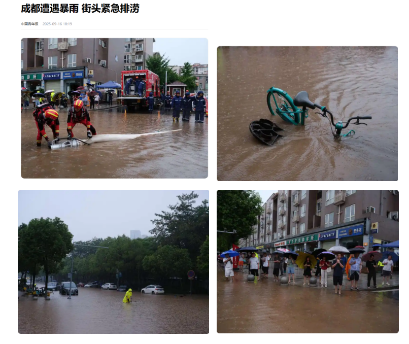 916日上午,成都多地遭逢暴雨,伴随雷电,早高峰时天色仍一片漆黑。暴雨也导致成都多地发生积水、内涝。