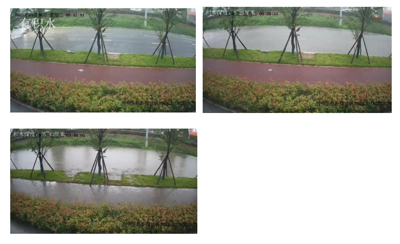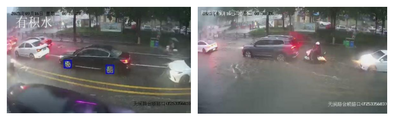 本轮强降雨,减灾所大陆多灾种预警系统的内涝预警技术实时产出了内涝预警,通过已汇集的部分摄像头实时视频画面,结合AI可以实现识别路面是否积水及积水深度,有效为应急部门提供有力的技术支撑。