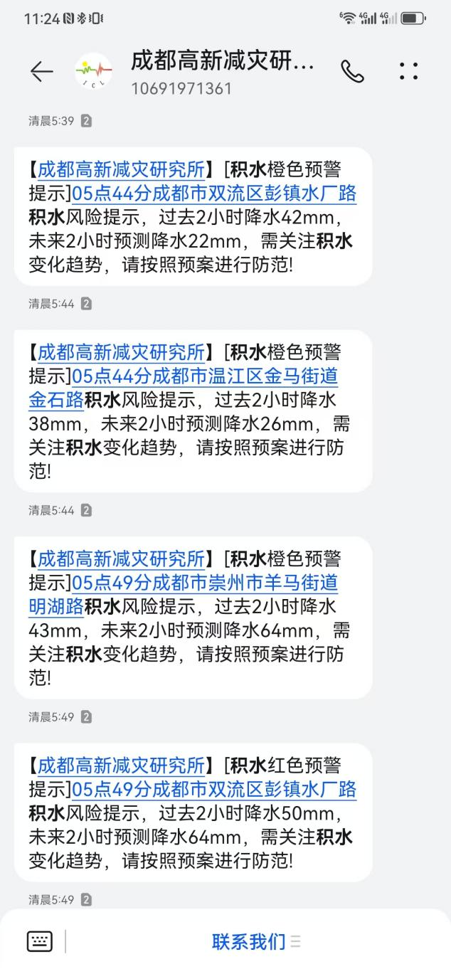 同时大陆多灾种预警系统的积水预报预警系统也发出成都多地的积水内涝预报预警提示。