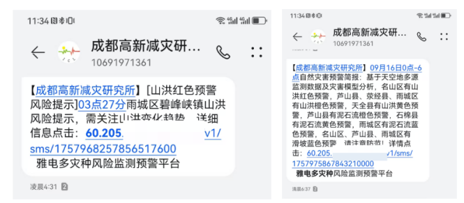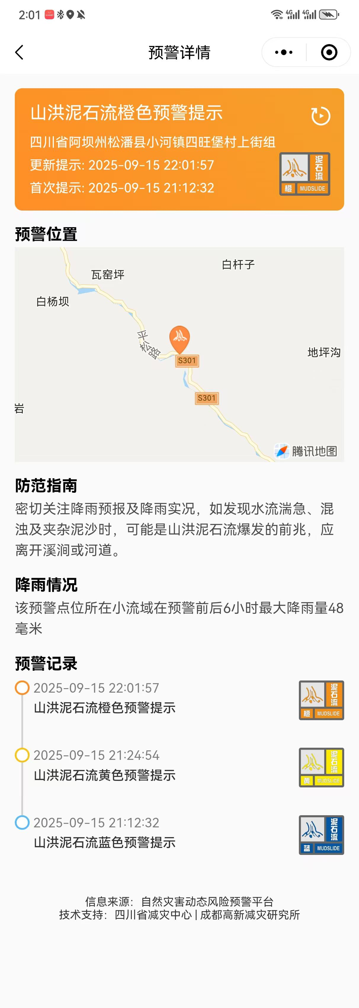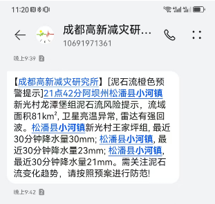 2、915日四川省阿坝州松潘县小河镇四旺堡村泥石流:减灾所大陆多灾种预警系统提前了18分钟成功预警,且预警信息同步给四川省应急厅应急指挥中心CA系统,启动值班人员调度乡镇,起到了减灾实效。