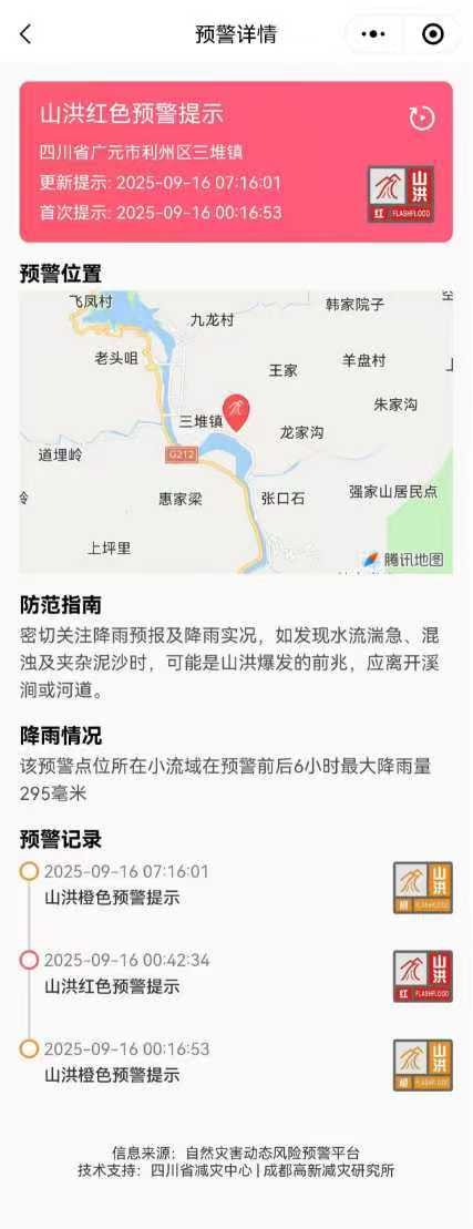 经查询,大陆多灾种预警系统于2025916001653秒发出三堆镇山洪泥石流橙色预警提示,于4234秒升级为山洪泥石流红色预警提示。提前103分钟成功预警此次山洪泥石流灾害事件,并且反映出大陆多灾种预警系统基于短临降雨的准确性,从而能产出更可靠的自然灾害预警提示信息。
