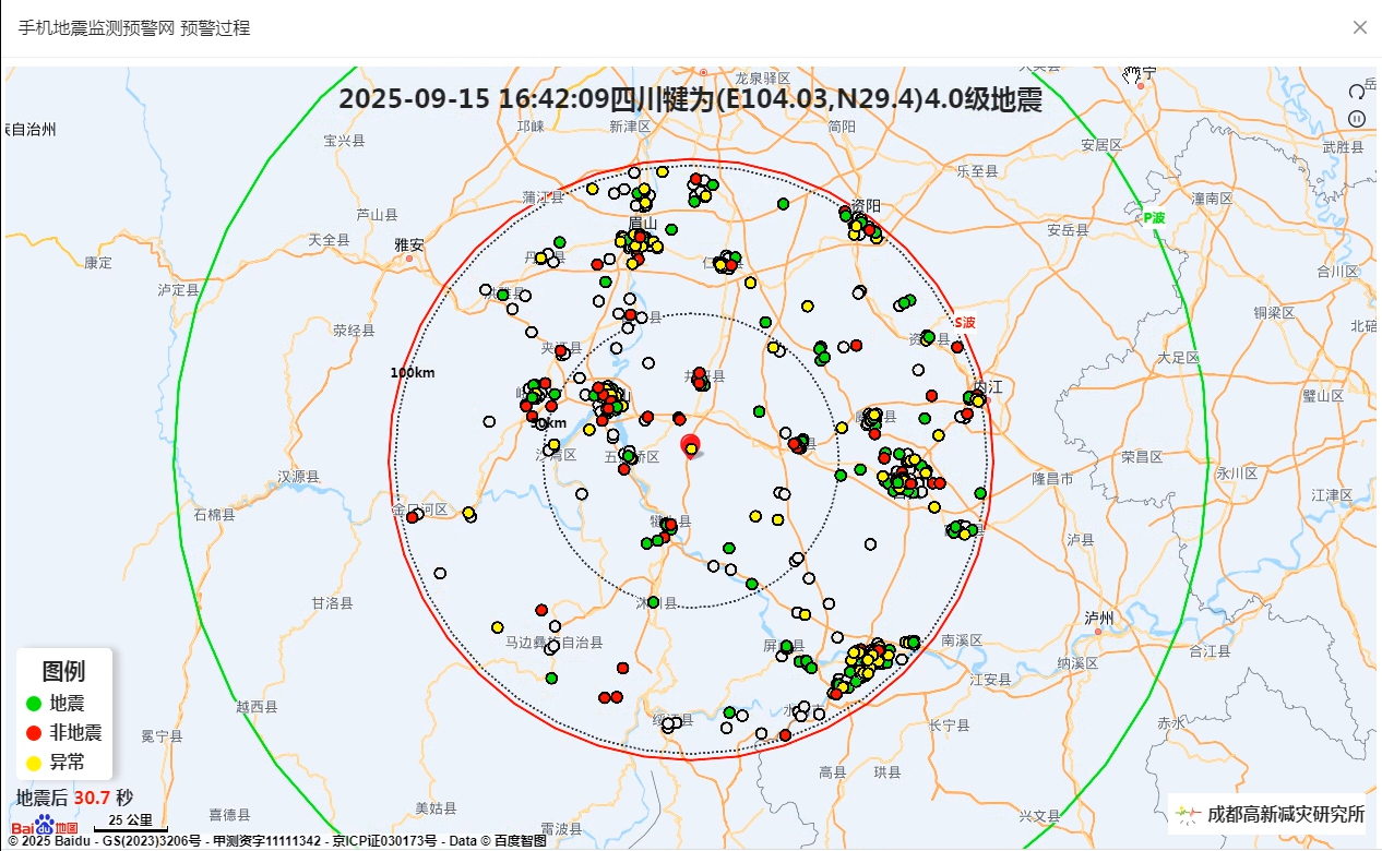 9151642分四川乐山犍为县4.0级地震,中国地震预警网在地震发生时第6秒发出预警,给乐山市提前4秒预警,给成都市提前35秒预警。并通过手机、电视、微博、专用终端等多渠道同步推送了此次预警信息。
