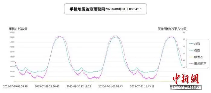 处于地震预警监测状态的手机数量与手机地震监测预警网覆盖面积随时间的演化图。成都高新减灾研究所供图