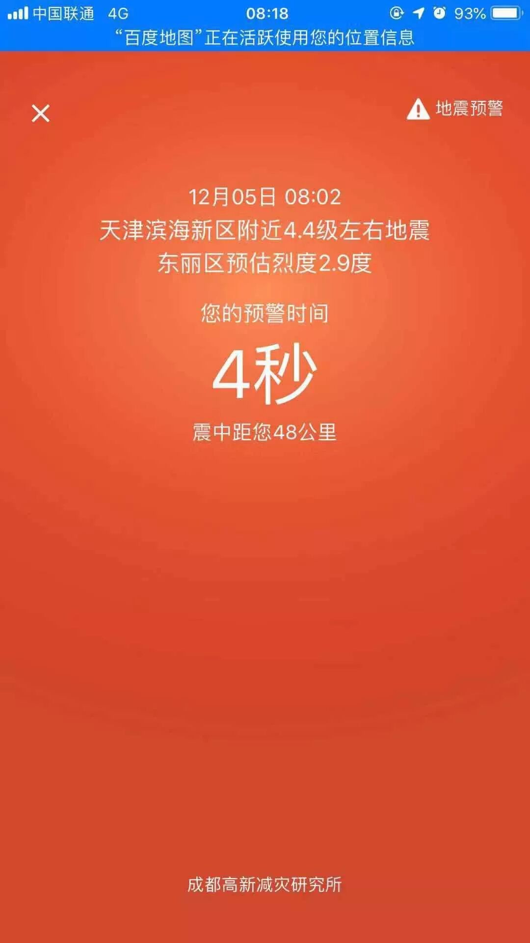 中新网成都12月5日电 (记者 贺劭清)记者5日从成都高新减灾研究所获悉,当日8时02分河北唐山市丰南区发生4.5级地震,京津冀多地有震感,成都高新减灾研究所与应急管理部门(原地震部门)联合建设的大陆地震预警网,成功预警本次地震,预警震级为4.8级,给唐山市提前2秒预警,给天津市提前11秒预警。